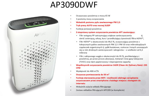 MPF — MULITLAYER PURIFYING FILTER to zestaw trzech filtrów oczyszczających powietrze: z Filtr wstępny PP zatrzymujący większe zanieczyszczenia Kupując w sklepie xdom inteligentne domy zyskujesz 100% skuteczny i oryginalne urządzenia. Oczyszczacz powietrza AP3090DWF potrafi zatrzymać różnorodne zanieczyszczenia tj. sierść zwierzęcą, włosy, kurz i przedłużający żywotność filtra HEPA™, z Filtr HEPA™ o skuteczności do 99,97 %, oczyszczający powietrze z toksycznych pyłów zawieszonych PM 2,5 i PM 10 oraz mikroskopijnych cząsteczek organicznych (o wielkości od 0,3 mikrona) tj. pyłki kwiatowe, roztocza, grzyby i innych unoszących się w nim drobnych zanieczyszczeń i alergenów z Filtr z aktywnego węgla eliminujący z powietrza, po przez proces absorpcji, metanal i inne toksyczne gazy VOC oraz dym papierosowy i nieprzyjemne zapachy