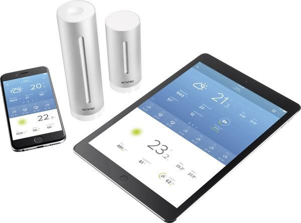 Stacja pogodowa Netatmo: osobista stacja pogodowa do wewnątrz i na zewnątrz wraz z darmową aplikacją sprawiają, że pogoda i jakość powietrza mogą być monitorowane w smartfonie lub na tablecie. Stacja pogodowa Netatmo umożliwia monitorowanie czynników klimatycznych, takich jak temperatura, wilgotność powietrza, ciśnienie atmosferyczne, stężenie CO2 i wiele więcej. Stacja pogodowa mierzy indywidualne parametry i przekazuje dane przez WiFi do aplikacji Netatmo. Obudowa obu modułów jest wykonana z monolitycznego kawałka wytrzymałego aluminium i wyróżnia się miękkim, eleganckim wzornictwem.