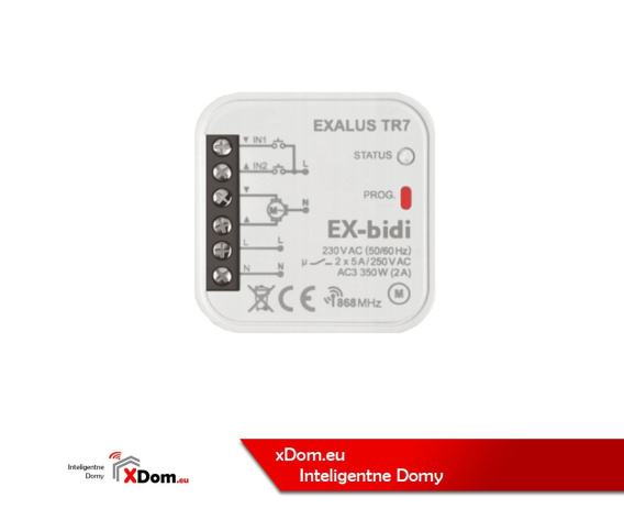 Sterownik rolet EX-BIDI przeznaczony jest do sterowania roletami okiennymi napędzanymi silnikami jednofazowymi 230 VAC. Sterowanie może odbywać się bezprzewodowo z poziomu nadajników systemu sterowania EXALUS HOME lub kontrolera TR7 oraz przewodowo z poziomu przycisków żaluzjowych. Odbiornik posiada zaimplementowaną funkcję zdalnej aktualizacji oprogramowania z poziomu centrali TR7 – wymagane jest do tego podłączenie centrali do sieci Internet.