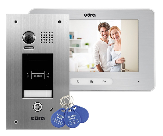 W skład zestawu wchodzi: VDA-72A5 Kaseta zewnętrzna wideodomofonu montowana podtynkowo. Kaseta wideodomofonu z czytnikiem kart. VDA-28A5 to kolorowy monitor 7 cali w kolorze białym, Umożliwia nagrywanie zdjęć i nagrań dzięki pamięci zewnętrznej i wewnętrznej.