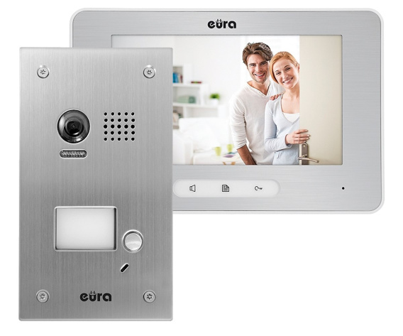 W skład zestawu wchodzi: VDA-76A5 Kaseta zewnętrzna wideodomofonu montowana podtynkowo. VDA-28A5 to kolorowy monitor 7 cali w kolorze białym, Umożliwia nagrywanie zdjęć i nagrań dzięki pamięci zewnętrznej i wewnętrznej.