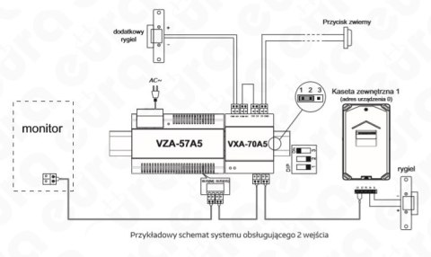 możliwość zdalnej obsługi systemu za pomocą stacjonarnego lub komórkowego aparatu telefonicznego. Oprócz kaset zewnętrznych, istnieje możliwość podłączenia do systemu również kamer monitorujących CCTV.
