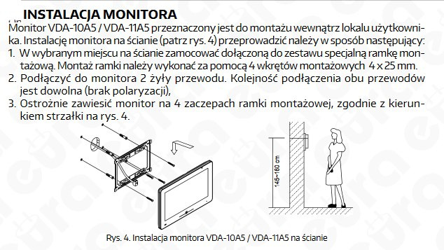 VDA-10A5 to kolorowy monitor z dotykowym ekranem, pracujący w 2-żyłowym systemie Eura Pro 2 Easy. Umożliwia nagrywanie zdjęć i nagrań z kasety wewnętrznej dzięki pamięci zawenętrznej i wewnętrznej. W rozbudowanej konfiguracji systemu dostępna jest funkcja interkomu wewnątrz- i międzylokatorskiego
