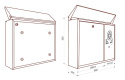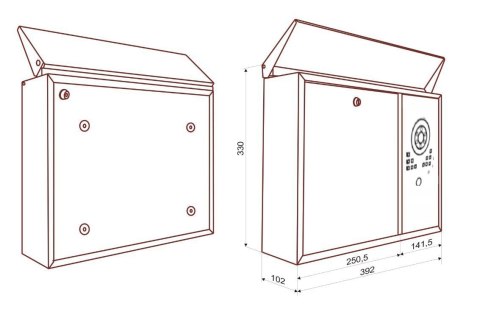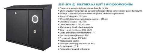 Dane techniczne: Typ skrzynki – naścienna, wisząca Liczba wrzutów – jeden Materiał – blacha ocynkowana elektrolitycznie lakierowana proszkowo Liczba przycisków wideodomofonu – 1 Typ zastosowanej kamery – S551 Szerokość skrzynki – 392 mm Wysokość skrzynki do najwyższego punktu – 330 mm Głębokość skrzynki – 102 mm Otwór wrzutowy – 233 x 32 mm Wbudowany dławik dla okablowania Kolor – grafit metaliczny (RAL 7021)