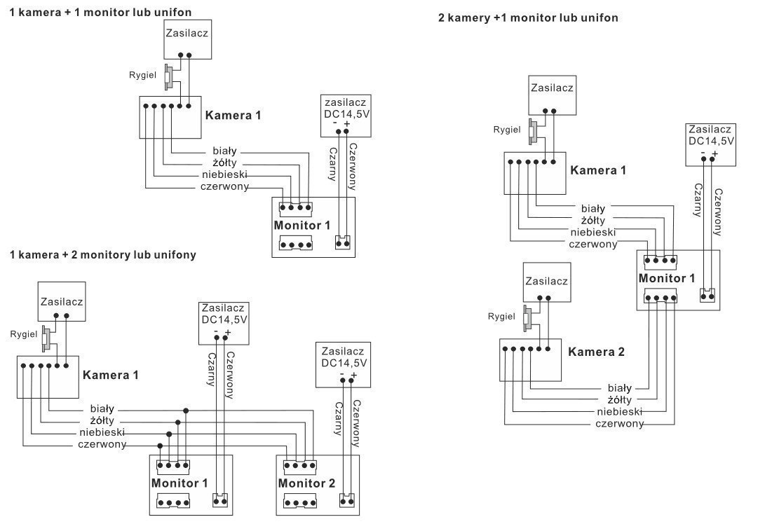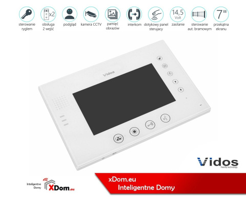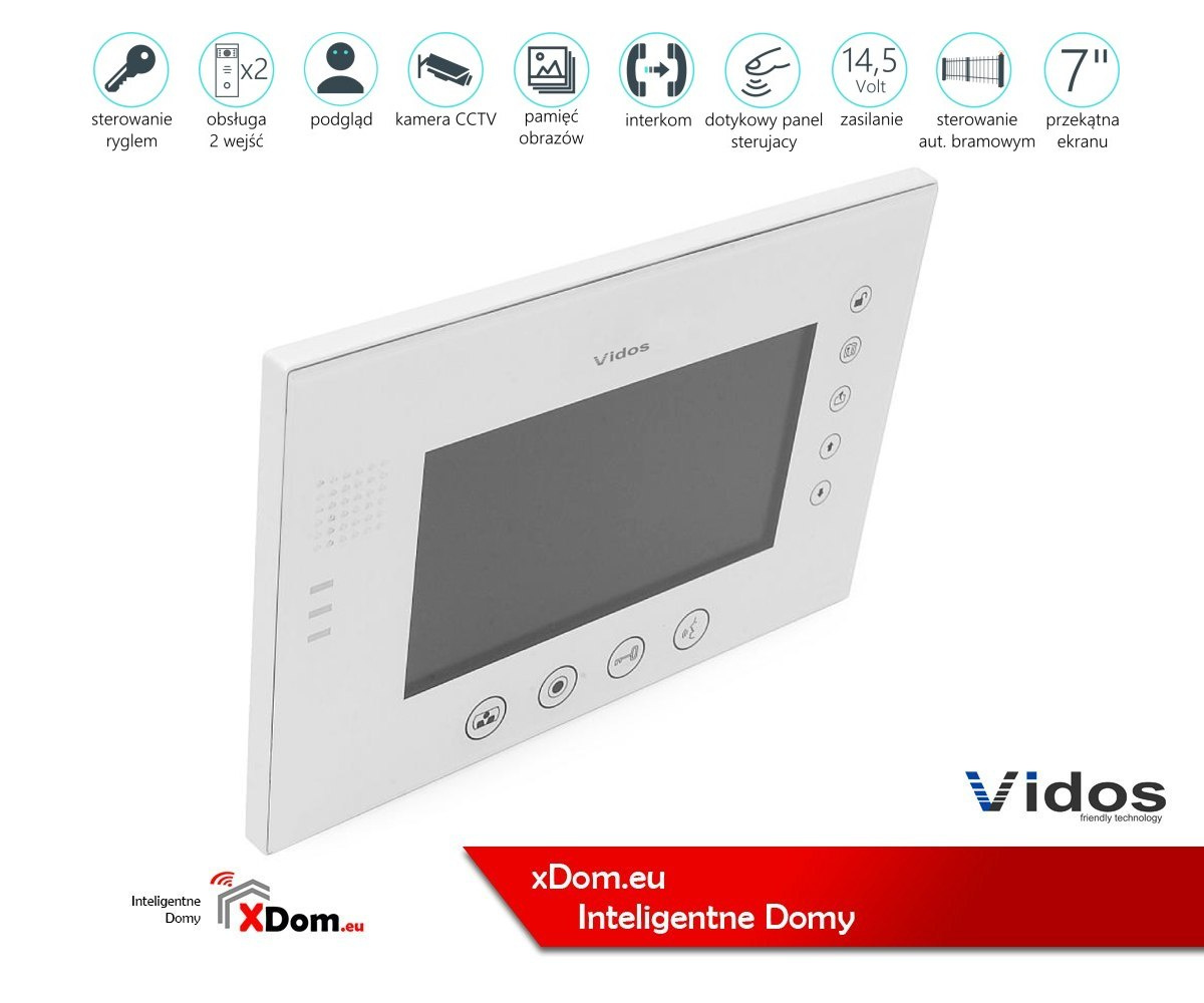FUNKCJE: Monitor głośnomówiący Ekran kolorowy 7” panoramiczny TFT LCD 800×600 Posiada wbudowaną pamięć o pojemności 100 zdjęć Obsługa 2 stacji bramowych (lub 1 stacja+1 kamera CCTV) Funkcja interkomu pozwala na komunikację głosową między urządzeniami wewnętrznymi Dotykowy, podświetlany panel sterowania ( kolor podświetlenia – niebieski) Sterowanie elektrozaczepem i brama automatyczną Kolor obudowy: BIAŁY Regulacja parametrów monitora (głośność dzwonka,głośność rozmowy, jasność i kolor) Menu ekranowe w 8 językach (Polski, Angielski, Niemiecki, Francuski, Hiszpański, Włoski, Chiński, Rosyjski) Możliwość rozbudowy o 3 dowolnie wybrane, dodatkowe monitory lub unifony (z wyjątkiem monitorów z serii 900) Podgląd z możliwością włączenia dźwięku i otwarcia furtki Okablowanie : 4 + 2 do rygla + 2 do bramy Zasilanie: 14,5V DC Zasilacz na listwę DIN w komplecie Wymiary: 241x161x23mm