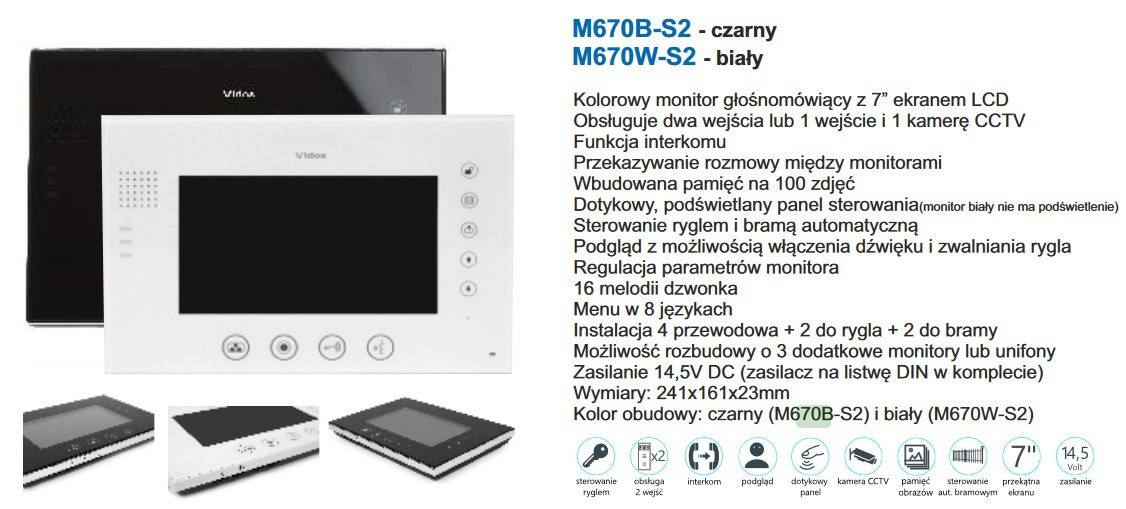 Głośnomówiący, bezsłuchawkowy monitor wideodomofonu Jeden z najczęściej wybieranych przez klientów monitor wyróżnia się wieloma cechami, które decydują o tym , że jest naprawdę wyjątkowy. Monitor posiada 7″ kolorowy ekran panoramiczny TFT LCD. Przedni panel wykonany z wysokiej jakości tworzywa ‚nano glass’ zapewniającego nowoczesny wygląd i bezpieczeństwo. Zaprojektowany i wykonany z wielką precyzją i dbałością o detale. M670 S2 posiada dotykowe klawisze sterujące oraz menu ekranowe w 8 językach. Monitor wyposażony jest w funkcję zapamiętywania zdjęć osób odwiedzających. Obsługuje 2 stacje bramowe (2 stacje lub 1 stacja + kamera CCTV). Możliwy podgląd z kamery Monitor wyposażony jest w funkcję interkomu i przekazywania rozmowy. System można rozbudować o dodatkowe 3 monitory lub unifony. Sterowanie elektrozaczepem i bramą automatyczną!!