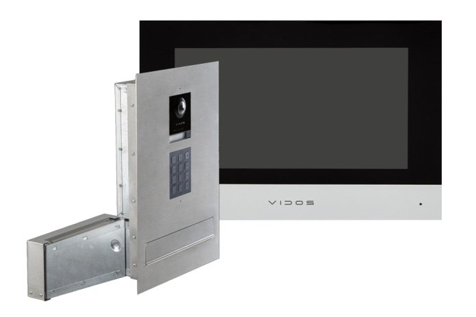 Wideodomofon oparty jest na technologii Vidos ONE. Jest to niezawodne i bardzo komfortowe rozwiązanie instalacyjne. Wideodomofon Vidos może współpracować z monitoringiem, istnieje możliwość integracji z systemami CCTV i SSWiN. Skrzynka przeznaczona jest do montażu w murkach o głębokości już od 260-410 mm. Zaletą tego wideodomofonu jest wyposażenie go w wysokiej klasy kamerę fisheye 2.0Mpix, jej kąt widzenia obiektywu to 190° szerokości i 96° wysokości. Dzięki wbudowanym diodą LED IR kamera umożliwia podświetlenie obrazu w nocy. Dodatkowo w skrzynkę wbudowany jest szyfrator Vidos A2000-D umożliwiający otworzenie zamka furtki za pomocą kodu. Skrzynka umożliwia integrację z systemem mobilnym IP. Umożliwia on zdalną obsługę wideodomofonu z dowolnego miejsca na ziemi, przeprowadzanie wideo - rozmowy, zdalne sterowaniem bramą i furtką. System jest bardzo nowoczesny i umożliwia korzystanie z najbardziej zaawansowanych technologicznie funkcji stawiając go na najwyższym podium wśród tego typu rozwiązań.